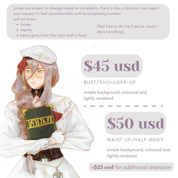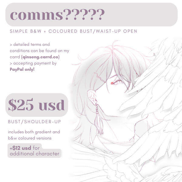 send me the commission type you want (b&w or coloured bust/half-body), a (as detailed as possible) description of the character(s) you'd like, and/or reference images.